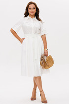 Платье из легкой плательной ткани. Платье отрезное по линии талии. По горловине переда и спинки - притачная планка. Легкая сборка от горловины по переду и по линии талии добавляет объема и воздушности. Юбка-клеш. Рукава - реглан, со сборкой по низу и широкими манжетами, застегивающимися на пуговицы и навесные петли. Застежка-молния-в боковом шве платья. Пояс в комплектацию не входит.