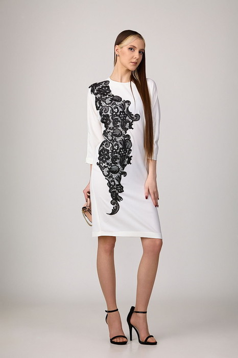 Платье из стрейчевой плательной ткани. Крой «летучая мышь» подойдет для любого типа фигуры и подчеркнет ее достоинства. Изюминка платья - роскошная нашивка из черного кружева. Застежка-молния в среднем шве спинки. Рукава трехчетвертные.