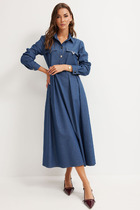 Платье полуприлегающего силуэта с коротким втачным рукавом. Деталь горловины переда и спинки, а также низ платья выполнены из ткани контрастного цвета.