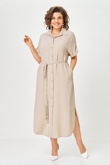 Платье женское прямого силуэта со спущенной линией плеча. Застежка центральная на 8 петель и пуговиц. Воротник отложной на стойке. По верхней части спинки кокетка, нижняя часть спинки со встречной складкой. В боковых швах карманы. По линии талии пояс в тон ткани. Низ рукава с манжетой и декоративной патой. Платье с фигурной линией низа и разрезами.