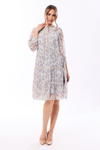 Платье женское полуприлегающего силуэта, слегка зауженное к низу с втачным рукавом. Горловина округлой формы с застежкой капелькой по переду. По линии груди переда вытачки. Спинка со средним швом и разрезом по низу. Рукав объемной формы состоит из двух деталей и декорирован тесьмой из пайеток. В верхней части рукава сборка. Нижний срез рукава присборен и обработан притачной манжетой с застежкой на петлю и пуговицу.