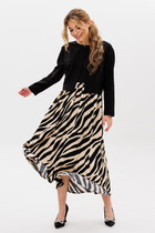 Платье женское полуприлегающего силуэта с втачным рукавом. Перед платья с горизонтальным швом по талии. Верхняя часть с вытачками по линии груди, нижняя часть со складками в области талии и карманами что обеспечивает прекрасную посадку и подчеркивает фигуру. Разрез по переду платья добавляет нотку игривости и удобства. В комплекте съемный ремень.