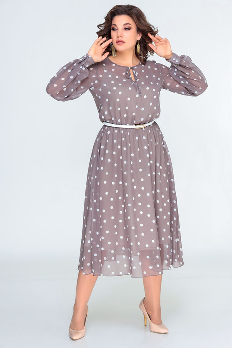 Платье из шифона на трикотажной подкладке. Лиф отрезной по линии и на резинке, низ расклешенный. Подкладка верхней части платья на бретелях. Рукав длинный втачной. По низу рукава сборка и притачная манжета, застёгивающаяся на 2 петли и пуговицы. Горловина округлой формы, по центру переда капелька с завязкой. В комплекте ремень.