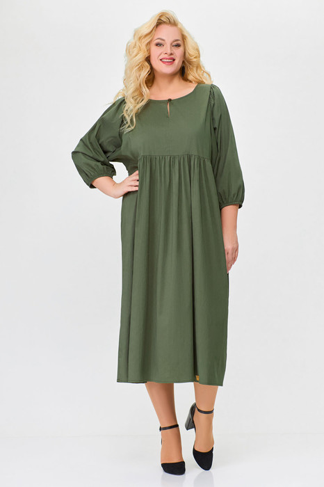 Платье отрезное по линии талии. Перед лифа со средним швом и разрезом с застёжкой по горловине на навесную петлю и декоративную пуговицу. Юбка со сборкой по линии талии и  карманами в боковых швах. По низу юбки пришита  фирменная эмблема «SWАLLOW». Рукав цельнокроеный, отрезной по линии проймы, со сборкой по окату. Низ рукава собран на эластичную тесьму.