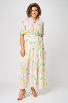 Платье А-силуэта, отрезное по линии талии. Платье - из струящейся принтованной плательной ткани. Перед лифа со средним швом и отложным цельнокроеным воротничком, выполненным из контрастной однотонной хлопковой ткани. По переду и спинке лифа расположены рельефы. В среднем шве спинки предусмотрена молния. Рукав втачной короткий формы «тюльпан».