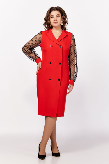 Нарядное платье из поливискозной ткани, полуприлегающего силуэта. Спереди имитация двубортной застёжки с декоративными пуговицами в два ряда. Полочки с фигурными бочками и нагрудными выточками. Спинка с центральным швом и талиевыми выточками. Горловина V-образной формы с отложными лацканами и воротником пиджачного типа. Рукав втачной длинный из отделочной ткани «сетка», по низу со сборкой и манжетой из основной ткани, застёгивающейся на петлю и декоративную пуговицу. В боковом шве застёжка на потайную тесьму-молнию.