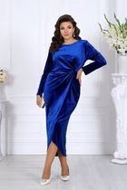 Платье из струящейся вискозной ткани, отрезное по линии талии. Лиф полуприлегающего силуэта. По полочке лифа центральный шов, нагрудные и талиевые вытачки, по спинке средний шов и талиевые вытачки. Горловина V-образной формы с отложным воротничком из отделочной ткани. Юбка расклешенная. Рукав втачной короткий, формы «тюльпан». В среднем шве спинки застёжка на потайную тесьму-молнию.