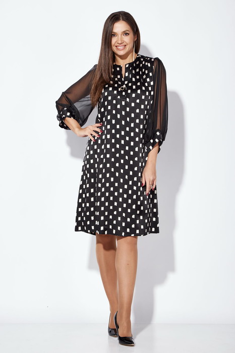 Платье женское, А силуэта, с втачным рукавом, длинной 3/4. Рукав расширенный к низу с разрезом по шву. Разрез зафиксирован на навесную петлю и отделочную пуговицу. Вырез горловины фигурной формы. Перед задекорирован вышивкой из паеток. По спинке средний шов и талевые вытачки. Застежка на потайную тесьму "молния" в среднем шве.