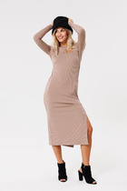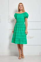 Платье женское, свободного силуэта, расширенное к низу. Рукав короткий, цельнокройный. Горловина круглой формы.По спинке небольшой разрез в средном шве, акцентирован декором "монетка" Разрез выше линии тали, по переду регулируется с фиксаторами. По центру спинки небольшая сборка. Подрез по линии бедер оформлен присобранным воланом.