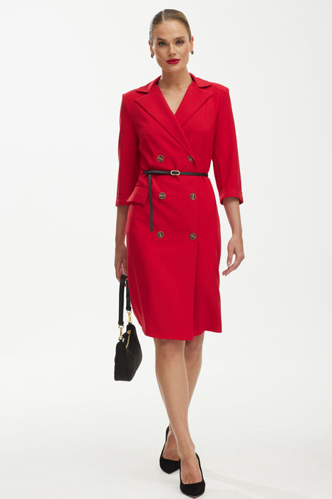 Платье женское, полуприлегающего силуэта, с двубортной застежкой на петли - пуговицы. Платье выполнено из ткани костюмно-плательной группы. По переду нагрудные выточки, в области бедер обработаны прорезные карманы с клапаном. Спинка с талиевыми вытачками. Рукава двухшовные, длиной 3/4, с притачной манжетой. Горловина оформлена воротником пиджачного типа. В комплект входит съёмный пояс.