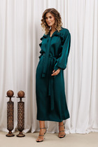 Платье женское, полуприлегающего силуэта, слегка зауженное к низу. Платье выполнено из велюра на трикотажной основе. По переду расположен фигурный подрез под грудью, а также рельефы, идущие из проймы через центр груди и переходящие в талиевые вытачки. На спинке расположены талиевые вытачки и средний шов, с застежкой на тесьму-молнию, по низу - разрез. Рукав короткий одношовный. Горловина — «лодочка», по переду переходящая в V-образный вырез «капелька».