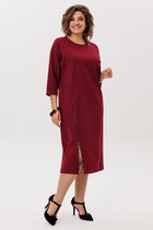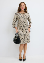 Платье полуприлегающего силуэта, длиной миди, выполненное из поливискозного трикотажного полотна. Перед с нагрудными вытачками и фигурным v-образным вырезом горловины. Горловина декорирована горизонтальным элементом из основной ткани и декоративной съёмной цепью. Спинка со средним швом, в котором обработана потайная молния. Рукав втачной одношовный длиной 3/4.