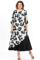 Сарафан женский прямого силуэта на широких бретелях. Выполнен из хлопчатобумажной плательной ткани с растительным принтом. Сарафан с открытой линией плеч и цельнокроенным рукавом до линии локтя. Низ рукава обработан притачной манжетой. Перед сарафана с нагрудными вытачками. Спинка цельнокроенная. По линии талии обработана планка с эластичной резинкой. На планке расположен декоративный пояс, завязывающийся на бант. В области бедер в боковых швах обработаны карманы. В нижней части боковых швов сарафана обработаны разрезы.