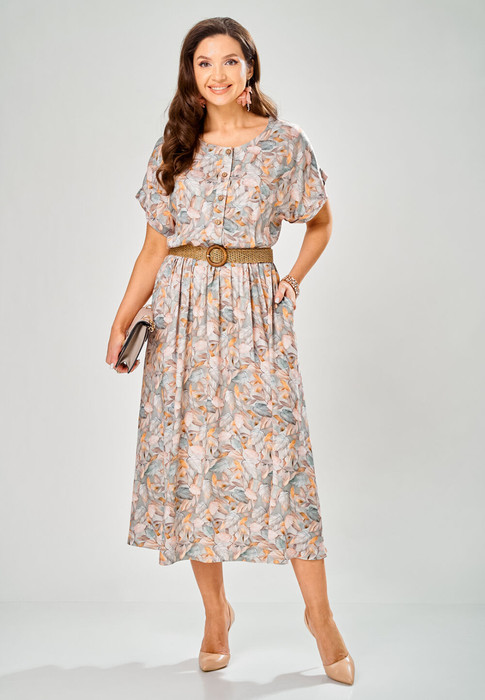Платье женское полуприлегающего силуэта длиной мидакси. Платье с круглой горловиной и со спущенной линией плеча. Нижняя часть плеча, переходящая в цельнокроенный короткий рукав, обработана притачной манжетой. На верхней части переда платья обработаны нагрудные вытачки. Платье с центральной застёжкой на петли и натуральные пуговицы, на притачной планке, обработанной до линии талии. Верхняя часть спинки цельнокроенная. Нижняя часть переда и спинки цельнокроенные. В боковых швах, в области бедер обработаны карманы. По линии талии расположена эластичная резинка, регулирующая прилегание. В комплект к платью входит плетёный декоративный ремень.