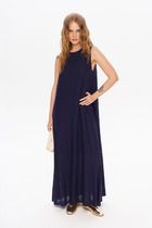 Льняное платье свободного кроя в насыщенном тёмно-синем оттенке — идеальный спутник для городских прогулок и отпускных маршрутов. Мягко драпирующаяся ткань дарит ощущение лёгкости и свободы, а вышивка с пальмой и надписью "Everyday Luxury from URS" добавляет экзотическую нотку и подчёркивает расслабленный шик.