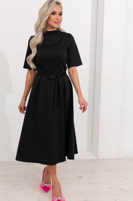 Элегантное платье приталенного силуэта выполнена из трикотажного полотна. Короткий втачной рукав. Горловина оформлена цельнокроеной стойкой, по спинке застежка на потайную молнию. Модель отрезная по линии талии. Юбка расклешенного силуэта. По переду и по спинке пущены мягкие встречные складки. Низ ровный, без разрезов. Тканевый пояс дополнительно акцентирует талию. Пояс из основного материала в комплекте.