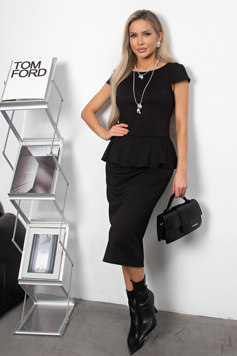 Элегантное платье полуприлегающего силуэта выполнено из трикотажного полотна. Короткий рукав-крылышко. Горловина на внутренней обтачке. По спинке застежка на потайную молнию. Модель отрезная по линии талии оформлена баской. Низ ровный, сзади разрез.