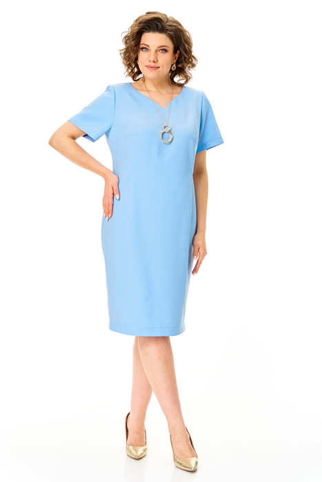 Платье женское полуприлегающего силуэта с естественной линией плеча.Рукав короткий втачной одношовный.Горловина оригинальной авторской формы.По переду выполнены нагрудные и талиевые вытачки.Спинка с вытачками.В среднем шве спинки застежка на потайную тесьму-молнию и шлица.В комплект входит декоративная подвеска.