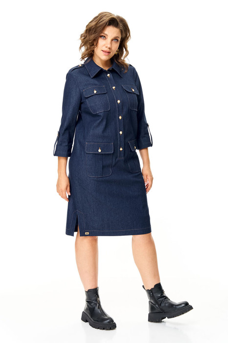 Платье прямого силуэта с естественной линией плеча. Спинка со средним швом и кокеткой. Перед с нагрудными вытачками, накладными карманами и клапанами. По переду обработана отделочная отрезная планка с застежкой на петли-пуговицы. Рукав втачной одношовный длиной 3/4 с отделочной манжетой и патой по низу. На плечевых швах имеются отделочные паты с пуговицами. В боковых швах выполнены невысокие разрезы. На правой стороне переда, по низу, пришита декоративная нашивка. Отделочные строчки контрастного цвета. Вся фурнитура металлическая premium качества.