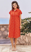 Платье полуприлегающего силуэта с естественной линией плеча с лёгким заужением по низу. Спинка со средним швом, талиевыми вытачками и застежкой на молнию. Перед с нагрудными и талиевыми вытачками. По переду обработана отделочная отрезная планка из полотна с пайетками. Для комфорта и практичности носки в шве притачивания планки переда обработана шлица. Вырез горловины V-образной формы. Рукав втачной одношовный длинный, выполнен из эластичной сетки. Низ рукава обработан манжетой из полотна с пайетками.