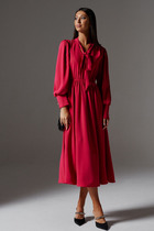 Платье женское А-образного силуэта со спущенной линией плеча. Рукав типа "летучая мышь". Горловина округлой формы. В среднем шве спинки застежка на тесьму-молнию. По переду выполнен ряд ассиметричных подрезов с кантами контрастного цвета и легкая сборка. В боковых швах обработаны карманы. Горловина, низ рукава и платья окантованы тканью контрастного цвета.