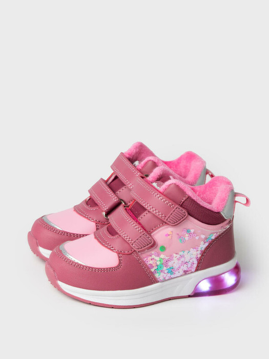 Стильные ботинки для девочки с огоньками. Кроссовки  выполнены из искусственной кожи, обладающей высокими эксплуатационными свойствами. Сбоку ботинки имеют большой прозрачный патч с цветными сердечками, которые при ходьбе пересыпаются по всей поверхности детали. Носочная и пяточная часть выполнена из специального защитного материала. Модель имеет светоотражающие элементы. В обуви стоит текстильная подкладка c высоким содержанием хлопка 80%, которая обладает высокой гигроскопичностью. Две липучки очень удобны для детей при обувании. Флисовая  стелька вынимается для просушки. Формоустойчивый задник поддерживает стопу в правильном положении. Эргономичная форма колодки обеспечивает правильное формирование стопы ребенка. Подошва из ТПР не скользит и устойчива к истиранию. Подошва с мигающим элементом flashlight.