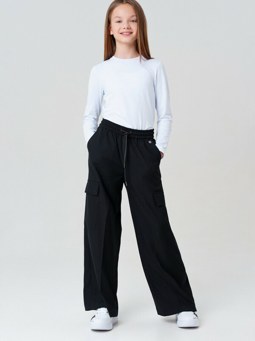 Идеальные брюки для школы, сочетающие комфорт и аккуратный внешний вид. Модель с посадкой Wide leg — это широкие брюки с расслабленной посадкой, максимальной длиной и акцентом на талии. Обеспечивает свободу движений, а резинка со шнурком позволяет легко регулировать посадку по фигуре.