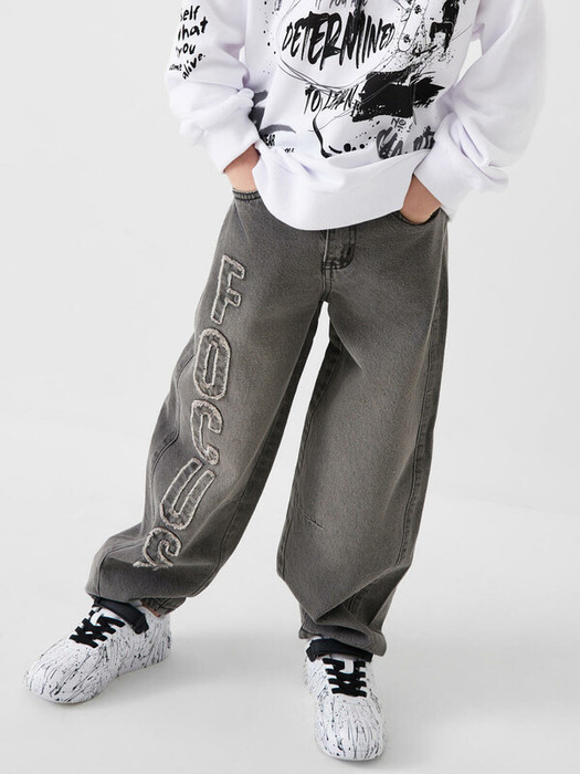 Джинсы багги для мальчика подростка. Модель выполнена из плотного варёного серого денима с классической посадкой и резинкой по спинке пояса, что делает посадку комфортной. Спереди — застежка на молнию и болт. Три кармана спереди, включая маленький "монетный". Сзади — два накладных кармана, на одном из которых расположен объёмный резиновый шеврон. Главный декоративный акцент — крупный вертикальный вышитый принт "FOCUS" на левой штанине.