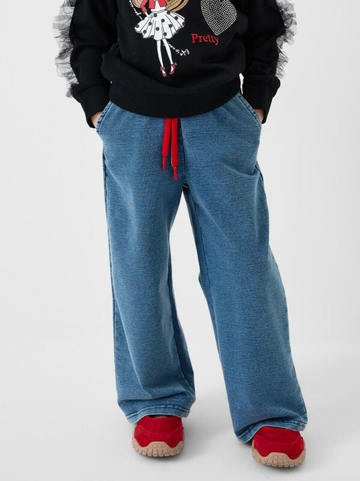 Детские брюки для девочки. Модель прямого кроя, выполнена из мягкого хлопкового трикотажа с эффектом денима. У брюк комфортный пояс на резинке и шнурок для регулировки. Спереди — два удобных кармана.