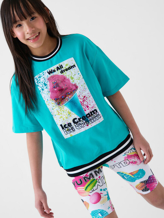 Футболка оверсайз для девочки подростка. Модель выполнена из эластичного хлопкового трикотажа джерси. На груди расположен крупный красочный принт. Горловина и низ обработаны эластичным рибом.