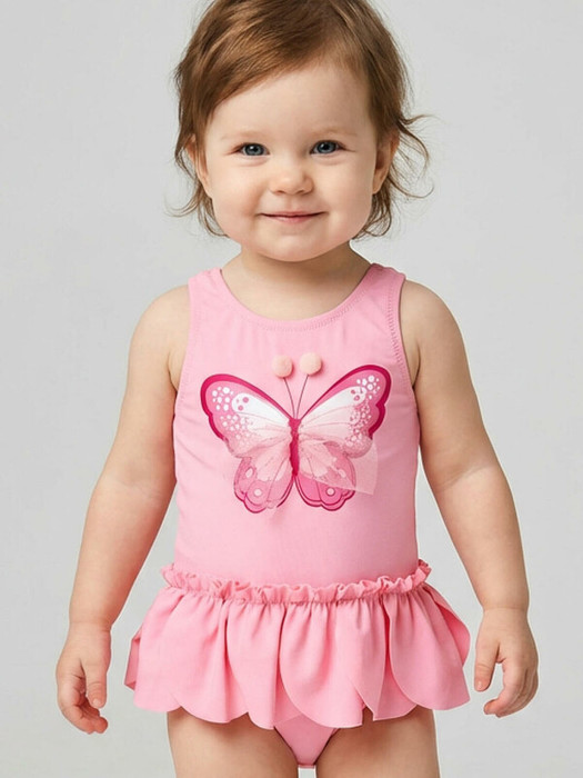 Детский слитный купальник для девочки. Выполнен в светло-розовом цвете с ярким принтом в виде бабочки. Украшен объёмными деталями и блёстками, что делает образ нарядным. По талии пришита декоративная юбочка из лепестков, создающая эффект воздушности. На спинке – контрастная вставка с милым бантиком. Все края обработаны эластичной тесьмой, чтобы изделие хорошо сидело на теле и не натирало. Благодаря UF-защите, ткань сохраняет первоначальный вид даже при длительном пребывании на солнце. Подходит для плавания и активного отдыха.