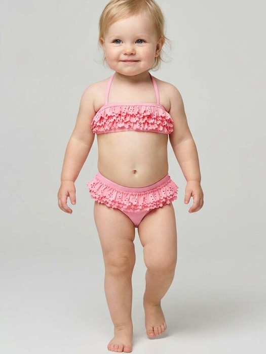 Детский купальник для девочки. Модель выполнена в нежно-розовом цвете и украшена объемными цветочными рюшами, которые создают яркий и праздничный образ. Топ на регулируемых бретелях. Плавки на подкладке средней посадки, также декорированы рюшами по талии. Все края обработаны эластичной тесьмой, чтобы изделие хорошо сидело на теле и не натирало. Благодаря UF-защите, ткань сохраняет первоначальный вид даже при длительном пребывании на солнце. Идеально подходит для пляжа и отдыха летом.