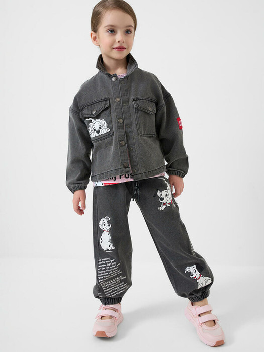 Детская джинсовая куртка для девочки. Застежка по центру на кнопках. Спереди — два накладных кармана с кнопками. На левом кармане и спинке принт с любимыми героями из мультфильма 1101 далматинец. Дополнительный акцент — красная нашивка с цифрой "101" на правом рукаве. Манжеты обработаны эластичной резинкой, а воротник выполнен в классическом стиле. Яркая и запоминающаяся модель с узнаваемым дизайном.