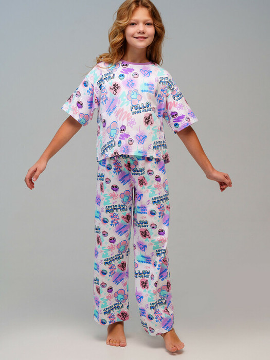 Пижама для девочки подростка. Футболка и брюки из эластичного и приятного на ощупь трикотажа. Штаны на резинке со шнурком. Высокое содержание хлопка 95%. Благодаря наличию эластана в составе ткани изделие держит форму и меньше мнется.