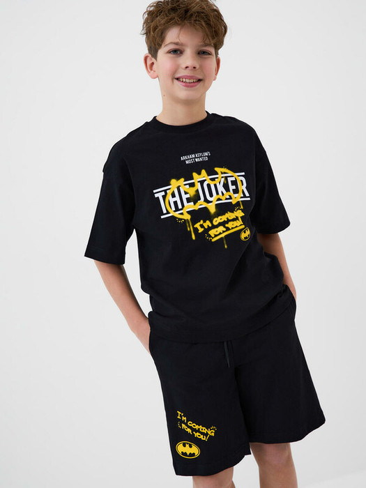 Пижама для мальчика подростка. Состоит из чёрной оверсайз футболки и шорт. На футболке — яркий лицензионный принт с Batman. Пояс на резинке со шнурком, по бокам — удобные карманы. Модель выполнена из мягкого, хлопкового трикотажа.