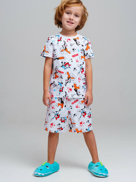 Пижама детская для мальчика. Футболка и шорты из эластичного и приятного на ощупь трикотажа. Шорты на резинке со шнурком. Высокое содержание хлопка 95%. Благодаря наличию эластана в составе ткани изделие держит форму и меньше мнется.