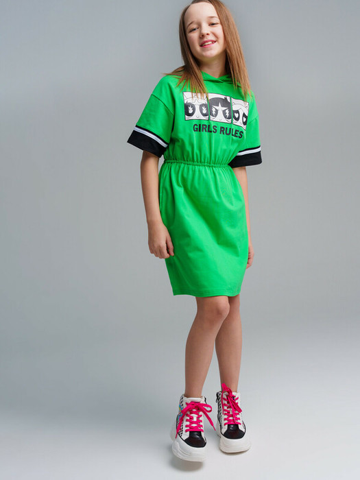Платье с капюшоном из качественного и приятного на ощупь трикотажа джерси. Высокое содержание хлопка 95%. Благодаря наличию эластана в составе ткани изделие проще в уходе и держит форму. По талии эластичная резинка.