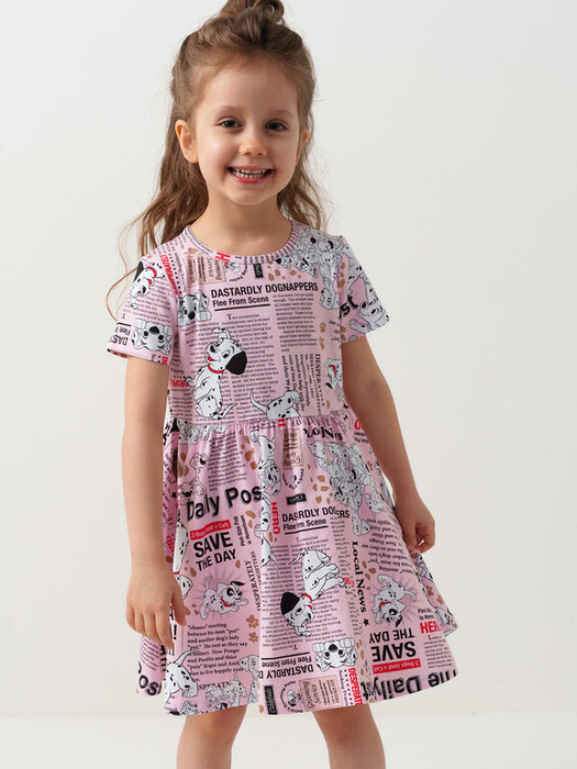 Детское платье для девочки. Модель с короткими рукавами, средней длины — до колена. Выполнено из мягкого хлопкового трикотажа джерси. Верхняя часть прямая, юбка со сборкой по талии создает легкий объем. Украшено ярким принтом с героями любимого мультфильма "101 далматинец". Швы усилены специальной силиконовой лентой, что делает платье износостойким.