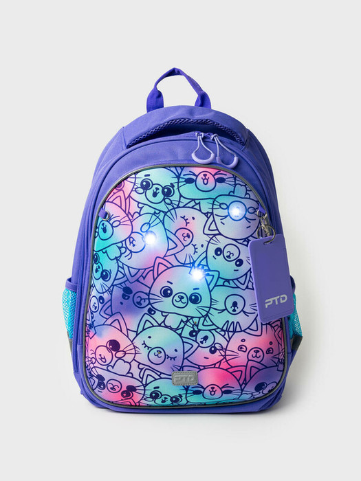 Уникальность дизайна ранца заключается в использовании светодиодных лампочек на передней панели. Формоустойчивый рюкзак с ортопедической спинкой для девочки школьницы. Конструкция ортопедической вентилируемой спинки обеспечивает максимальный комфорт и позволяет снизить нагрузку на спину школьников и дошкольников. Широкие мягкие  вентилируемые лямки регулируются по высоте, что делает рюкзак идеальным как для первоклассника, так и для детей из средней школы. Спереди лямки можно закрепить на застежку, чтобы они не спадали. Дно имеет уплотнение. Снизу дна имеются резиновые "ножки", чтобы низ рюкзака не пачкался. Рюкзак имеет два основных отделения на молнии. Внутри имеется несколько отделений и кармашков для систематизации школьных принадлежностей. По бокам есть карманы. У рюкзака есть две ручки: одна - мягкая вентилируемая ручка для ношения в руках, вторая маленькая - для того, чтобы рюкзак можно было вешать на вешалку. Модель выполнена из водонепроницаемой ткани. Рюкзак имеет светоотражающие детали на лямках, по бокам, на переднем отделении, чтобы ребенка было хорошо видно в темноте со всех сторон. В подарок идет пластиковый чехол для пропуска на растягивающейся пружине. Пружина дает возможность спокойно приложить пропуск к турникету не снимая рюкзак. Рюкзак в школу можно дополнить мешком для обуви и пеналом в том же дизайне. Размер рюкзака: 30*39*19 см. Вес рюкзака: 830 гр