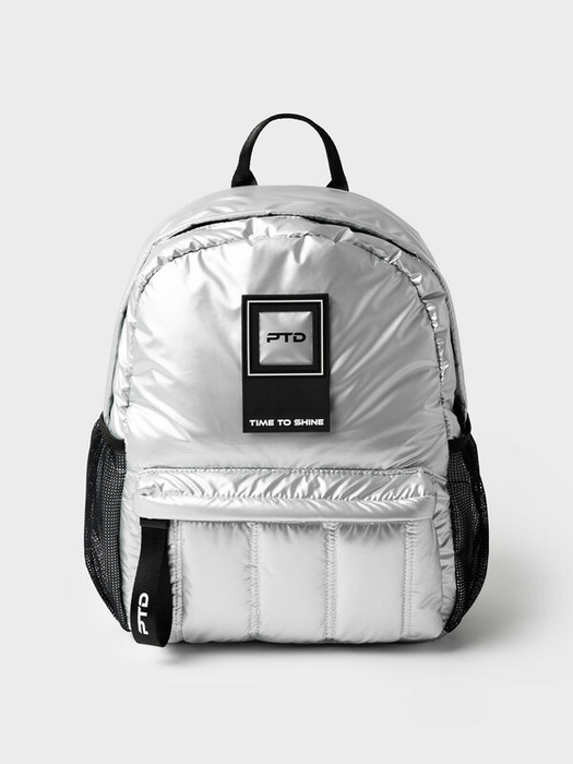 Модный рюкзак из серебристой дутой плащевой ткани для девочки подростка. Рюкзак для школы имеет одно отделение с различными карманами внутри для систематизации школьных принадлежностей. Снаружи есть большой карман на молнии, сбоку имеются карманы из сетки на резинке. Широкие мягкие вентилируемые лямки регулируются по высоте. У рюкзака есть ручка для ношения в руке и для того, чтобы его можно было вешать на вешалку. Ранец имеет светоотражающие детали на лямках. Рюкзак очень легкий и вместительный. К рюкзаку можно подобрать спортивную сумку в едином дизайне. Размер рюкзака: 30*40*15 см. Вес рюкзака: 470 гр
