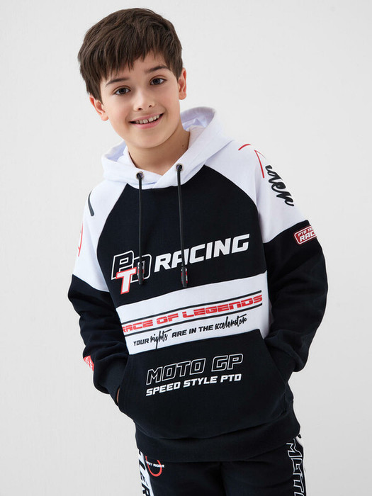 Худи оверсайз для мальчика подростка. Выполнено из хлопкового футера без начеса. На груди — крупный логотип и надписи, вдохновлённые мотоспортом. Капюшон регулируется шнурком, а на передней части расположен удобный карман-кенгуру. Манжеты и низ изделия выполнены из эластичного риба, что обеспечивает комфортную посадку. На правом рукаве — яркий силиконовый ярлык.