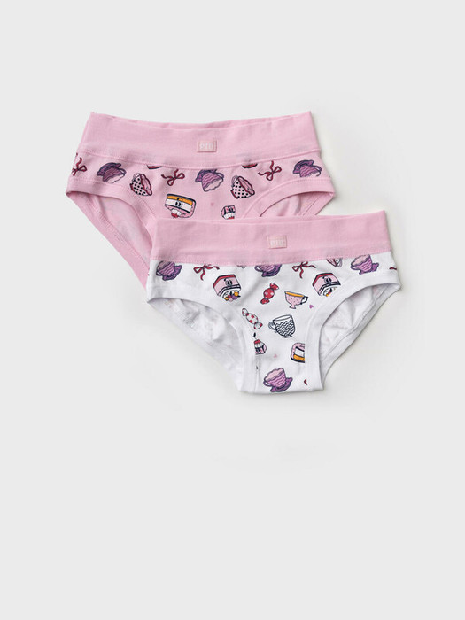Набор из двух детских трусов-брифов для девочки. Дизайн с любимыми сладостями - капкейками и конфетами. Изделия выполнены из мягкого эластичного трикотажа, с широкой розовой резинкой по поясу и окантовкой по вырезам для ног. Внутри предусмотрена ластовица.