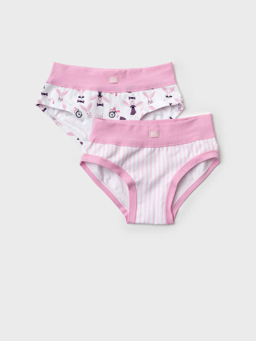 Набор из двух детских трусов-брифов для девочки. Дизайн с любимыми героями из мультфильма "Алиса в стране чудес". Изделия выполнены из мягкого эластичного трикотажа, с широкой розовой резинкой по поясу и окантовкой по вырезам для ног. Внутри предусмотрена ластовица.