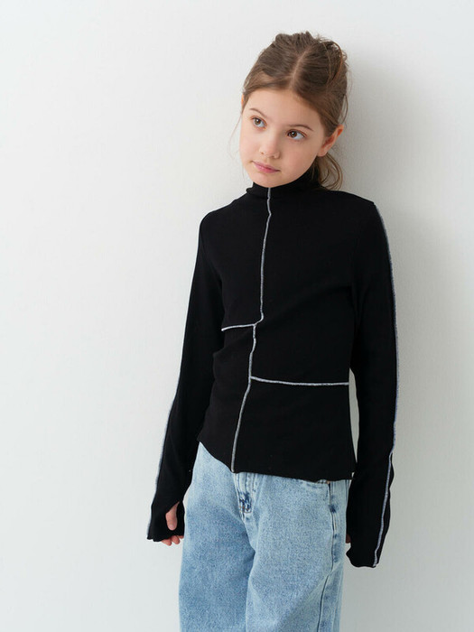 Водолазка для девочки подростка. Выполнена из эластичного трикотажа в рубчик. Имеет высокий воротник-стойку и длинные рукава с удобными прорезями для большого пальца. По линии переда, рукавов и боков проходят выразительные швы с белой отделочной строчкой, создавая стильный контраст на чёрном фоне.