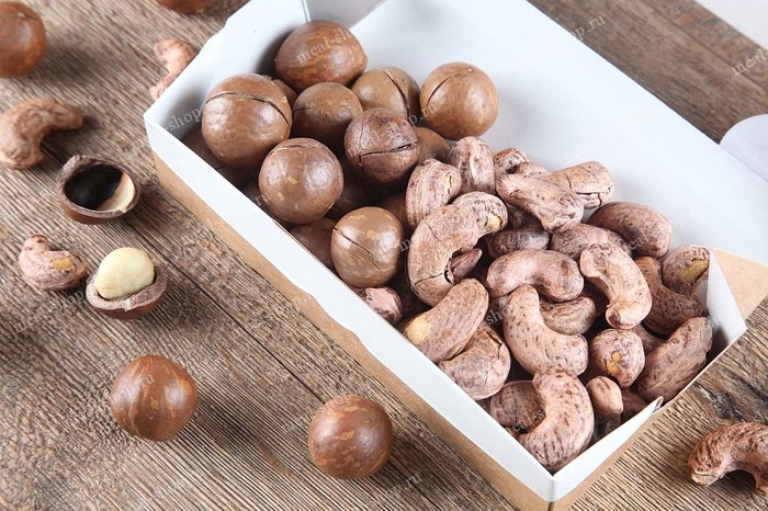 Состав: ядра ореха кешью жареного соленого крупного (Вьетнам), макадамия в скорлупе натуральная (Вьетнам)