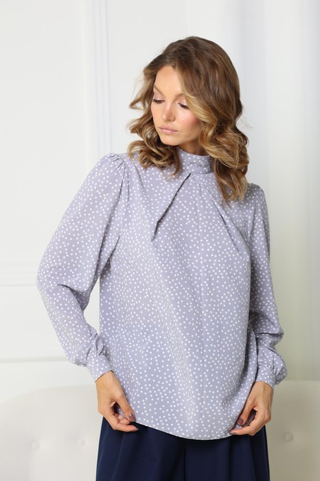Блузка с высоким воротом стойкой и застежкой на 2 пуговицы. Защипы от воротника по переду. Втачной рукав с манжетой на пуговице.