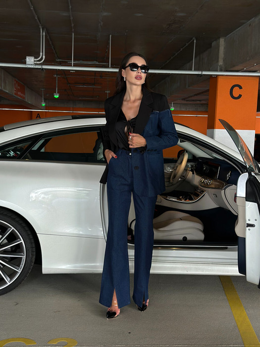 Брюки прямого силуэта, выполнены из плотного денима, с разрезами по переду. Застёжка - гульфик