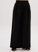 Брюки прямого силуэта большого объёма. Линия талии занижена. Пояс притачной. На передних половинках брюк карманы с отрезным бочком. На задних половинках брюк отрезная кокетка и накладные карманы.