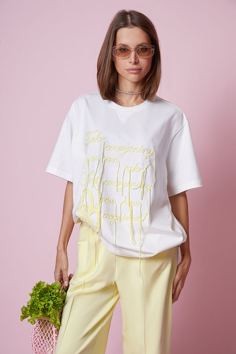 Футболка оверсайз выполнена из плотного хлопкового трикотажного полотна ( интерлок). Спущенная линия плеча. Короткий рукав. Горловина круглая с притачной фигурной планкой. Дизайнерская вышивка с элементами “вытрепаности” на передней половинке футболки. Вышивка выполнена шнуром.
