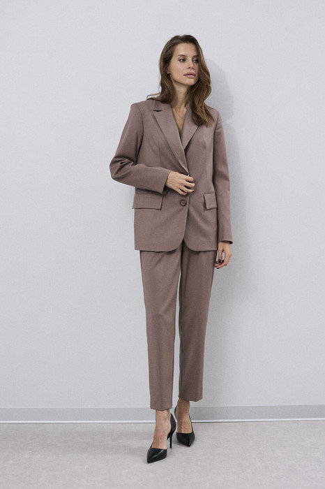Костюм женский двухпредметный , полуприлегающего силуэта ,выполненный из костюмного однотона высокого качества . Жакет с однобортной застежкой , рукав втачной двухшовный с декоративной шлицей снизу . Воротник стояче - отложной с отворотами  лацканов . По переду жакета также функциональные карманы с клапанами . Жакет на  подкладке. Брюки слегка заужены к низу , верх брюк обработан притачным поясом , по спинке пояса - резинка  . В верхней части брюк расположены карманы .